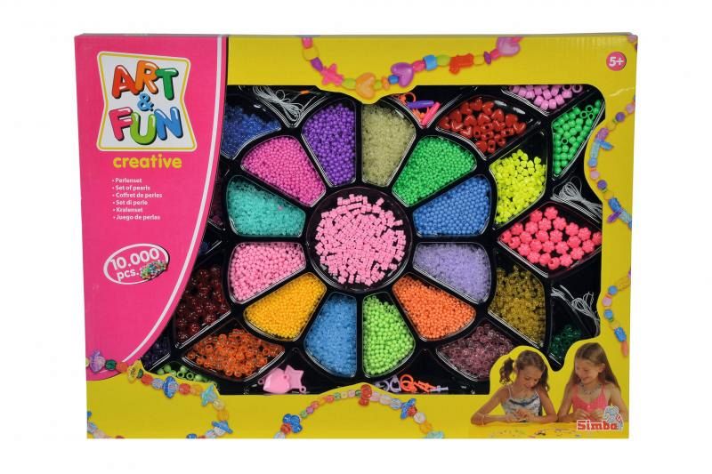 Sada korálků různých tvarů a barev v dárkovém balení. Navlékací šňůrka i spojky součástí. Obsahuje 10 000 korálků.