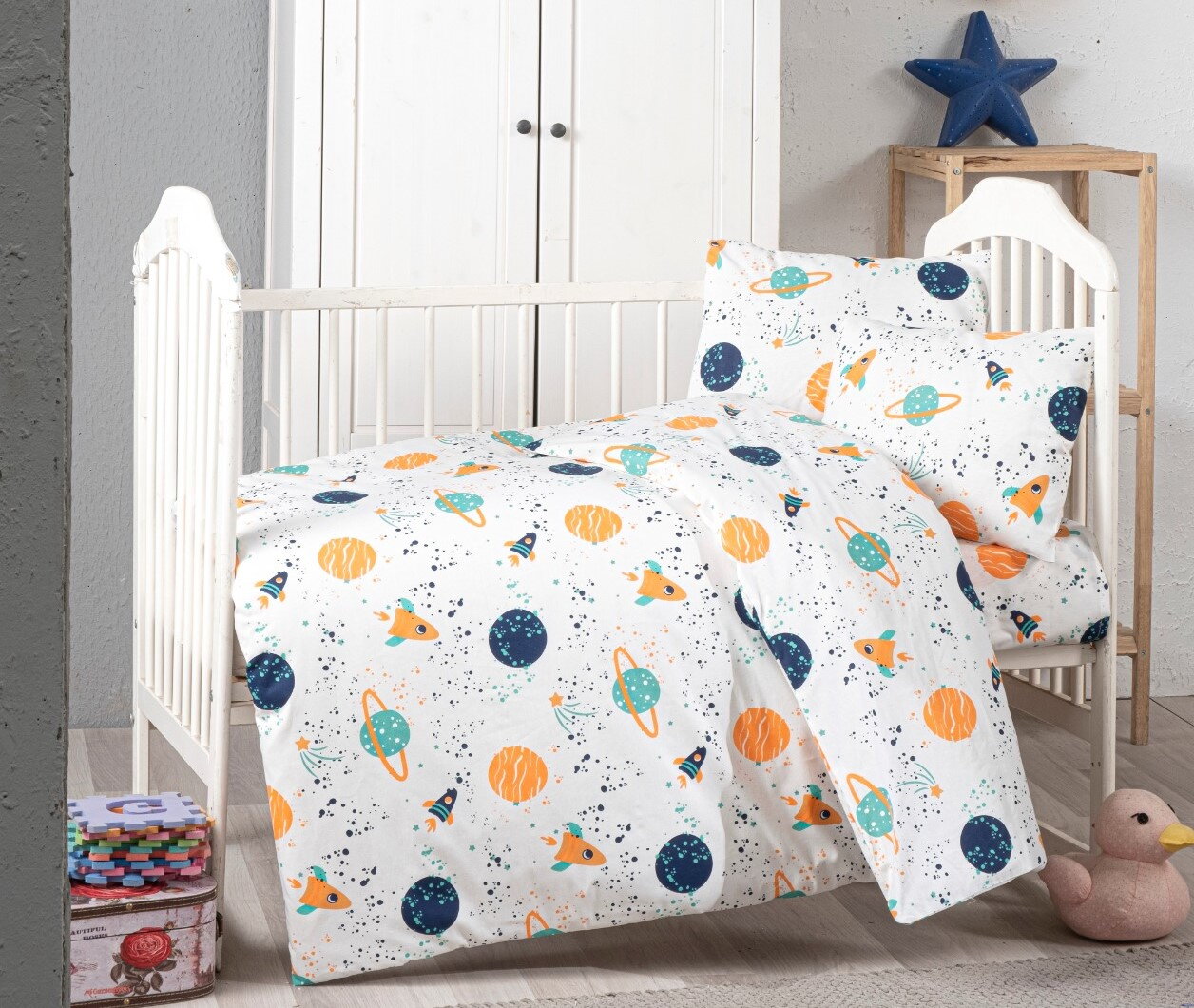 - Bavlněné dětské povlečení do malé postýlky 90x135, 45x60 cm vesmír, zapínání: zipový uzávěr