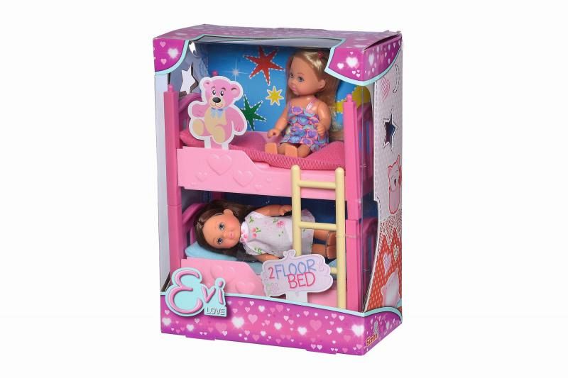 Panenky Evičky v pyžamu s palandou. Palanda lze rozložit na dvě postýlky. Součástí 2 polštáře a 2 deky. Výška panenky 12 cm.