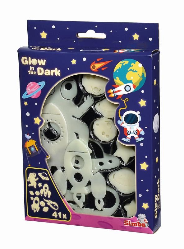 Sada fluorescenčních hvězdiček, astronauta, vesmírné lodi a dalších motivů, které po nasvícení ve tmě svítí. Dekorace vhodná k nalepení na stěnu, strop či nábytek. Včetně lepicí gumy. Sada obsahuje 41 ks.