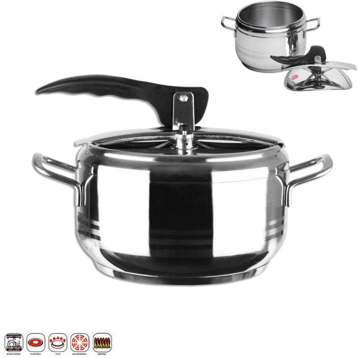 Kvalitní tlakový hrnec o objemu 3,5 l s víkem s pákovým mechanismem a třemi typy bezpečnostních ventilů, vhodný pro rychlé vaření na všech typech sporáků, včetně indukce. Je vhodný do myčky. Rozměry: š. 30cm x v. 13cm (bez poklice) x pr. 21 cm x obj. 3,5l.Dodatek: Pokud u zboží není specifikována barva výrobku, dodáváme v odstínu dle skladových zásob. Případně nám do poznámky upřesněte jakou barvu či motiv upřednostňujete.
