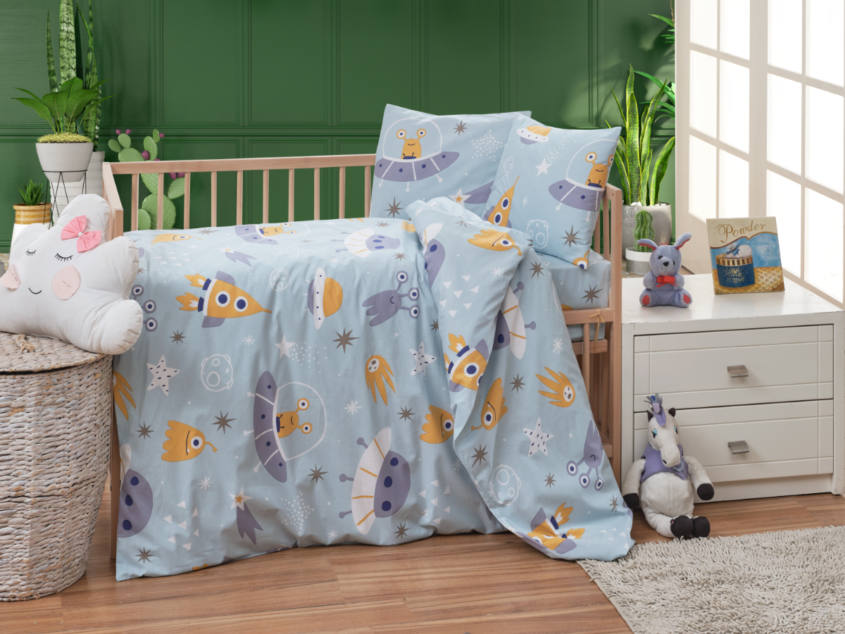 Krepové dětské povlečení do malé postýlky 90x135, 45x60 cm Vesmírné UFO, zapínání: zipový uzávěrskladem629 Kč