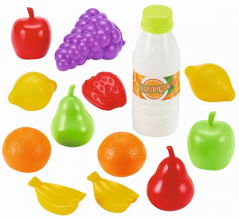 Makety potravin v síťce. Síťka obsahuje celkem 13 doplňků - 2 citrony, jahodu, 2 pomeranče, 2 jablka, 2 hrušky, 2 trsy banánů, hrozen vína a láhev pomerančového džusu. Ideální také jako vybavení obchodu nebo jako doplněk do dětské kuchyňky. Rozměry produktu (DxŠxV): 16 x 16 x 13 cm.