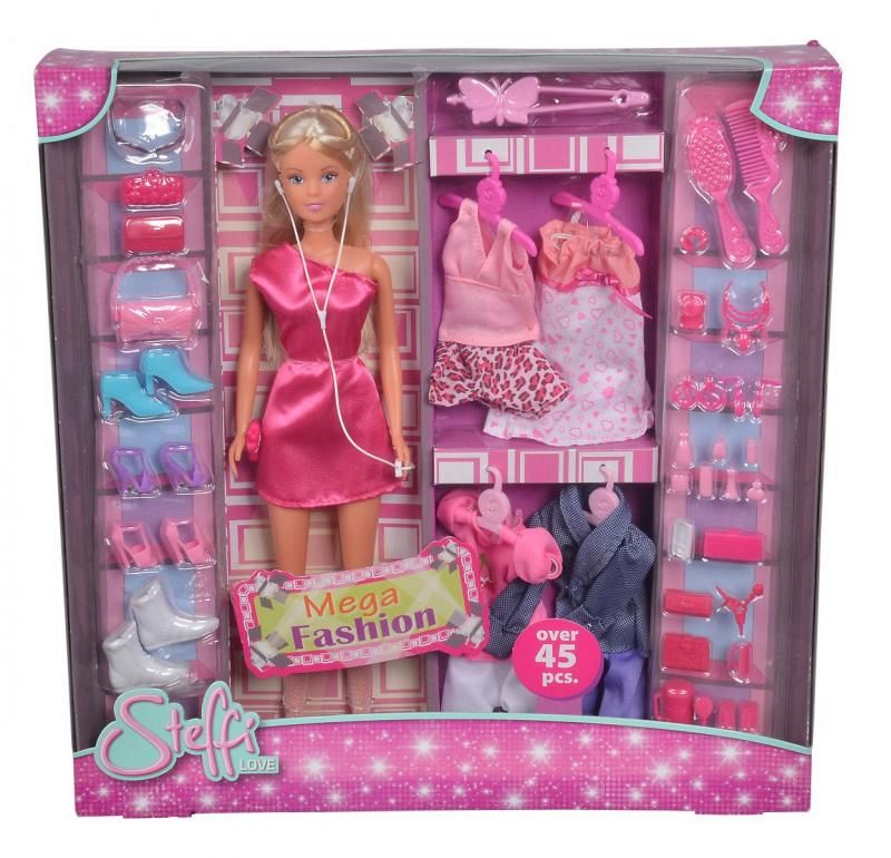Panenka Steffi se spoustou oblečků a příslušenství pro každou příležitost. Celkem obsahuje 45 ks. Výška panenky 29 cm.