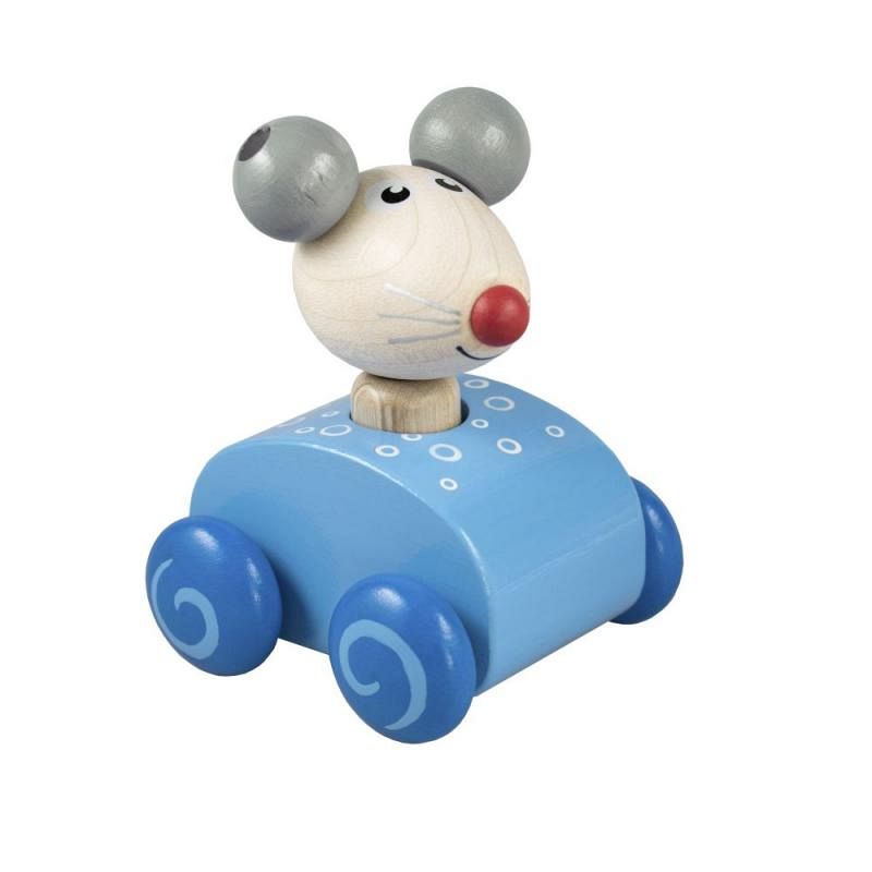 <p>Dřevěné pískací zvířátko ve tvaru myšky, po zmáčknutí hlavičky zapiští, v modrém provedení.