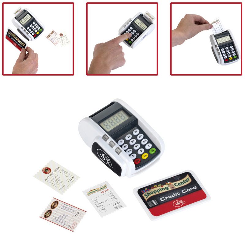 Platební terminál se zvukovými a světelnými efekty. Obsahuje 3 poukazy a 1 kreditní kartu s bezkontaktní funkcí. Baterie nejsou součástí balení. Vhodné od 3 let.