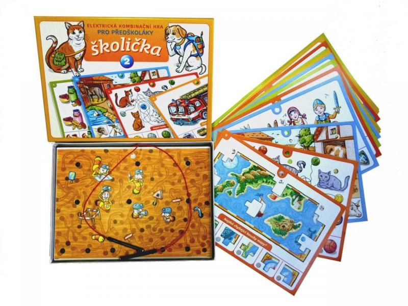 Školička elektrická výuková hra pro děti. Obsahuje 16 listů s mnoha obrázky, mezi nimiž děti hledají souvislosti. Vhodné pro děti od 4 let.