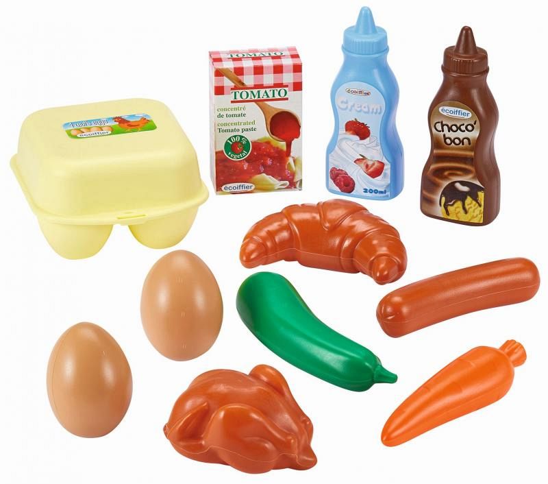 Makety různých potravin, v síťce. S touto sadou máte všechny ingredience pro perfektní snídani. Obsahuje balení vajíček a 2 vejce, kuře, párek, mrkev, okurku, croisant, rajskou omáčku a polevy. Ideální také jako vybavení obchodu nebo jako doplněk do dětské kuchyňky. Rozměry produktu (DxŠxV): 19 x 19 x 13 cm.
