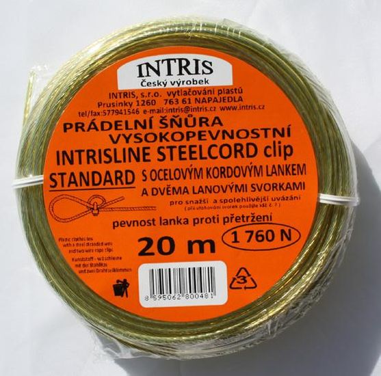 Značková vysokopevnostní prádelní šňůra s novým, ještě pevnějším ocelovým lankem kordového typu. HT kvalita použitých drátů, krátké stoupání závinu lanka a silné zatažení drátů dává tomuto typu šňůry nově nejen neuvěřitelně vysokou pevnost proti přetržení 1 990 N (199 kg), ale také zabraňuje riziku vzlínání vlhkosti vnitřkem lanka, což dává tomuto typu šňůry dlouhou životnost. Tuhost tohoto kvalitního lanka může uvazování šňůry činit obtížným. Proto prádelní šňůry v provedení CLIP jsou doplněny u každé jednotlivé šňůry dvěma pozinkovanými ocelovými lanovými svorkami pro snadnější a spohlivější uvázání. A proč dvě svorky ? Každá šňůra má totiž konce dva. K zatažení matek na svorkách je nejlépe použít klíč č. 7.