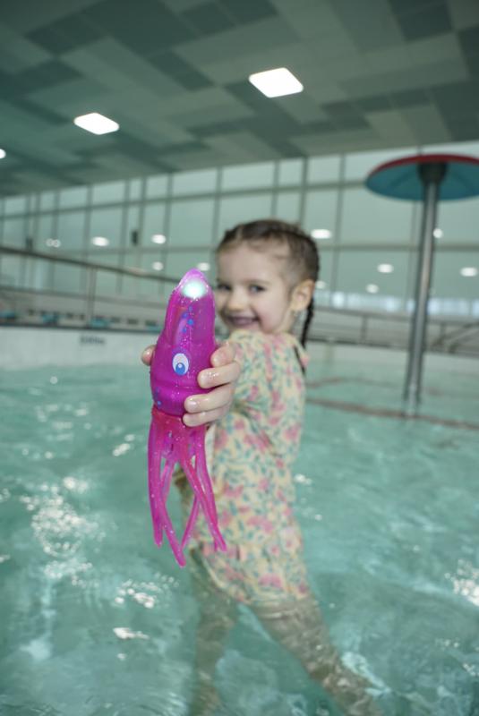 Oliheň Squiddy je velmi rychlá a snaží se ti uplavat. Při nárazu do vany nebo bazénu změní směr a plave dál. Při plavání svítí a otáčí se. Doženeš jí nebo ti uplave? Squiddy je zábavná hračka na léto, ale i na zimu. Může plavat v bazénu nebo ve vaně.
