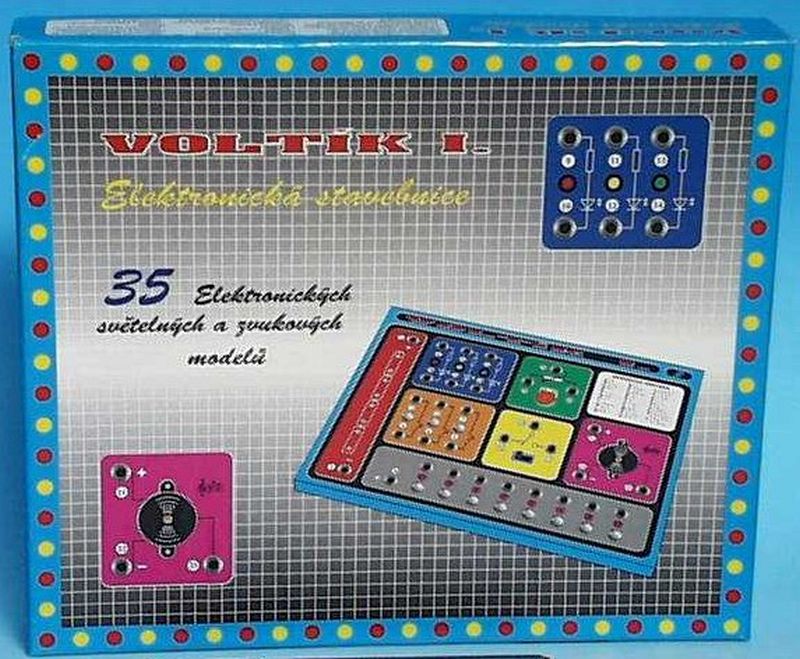 Stavebnice VOLTÍK I. umožňuje sestavit podle jednoduchých návodů nejméně 35 elektronických modelů bez pájení s barevnými světélky a tónovým bzučákem.